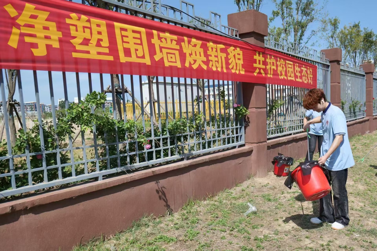 各二级学院志愿者在划定区域内协同作业,经过两个多小时的集中攻坚,校区围墙内外焕发新颜,道路整洁如新,绿植苍翠欲滴。