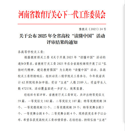 12月9日,省教育厅关工委公布了2025年全省高校“读懂中国”活动评审结果,我校获征文一等奖1项、二等奖1项,微视频二等奖1项,舞台剧二等奖1项;同时,我校由于活动组织有力,上报作品质量高,受到了省教育厅关工委的表扬。